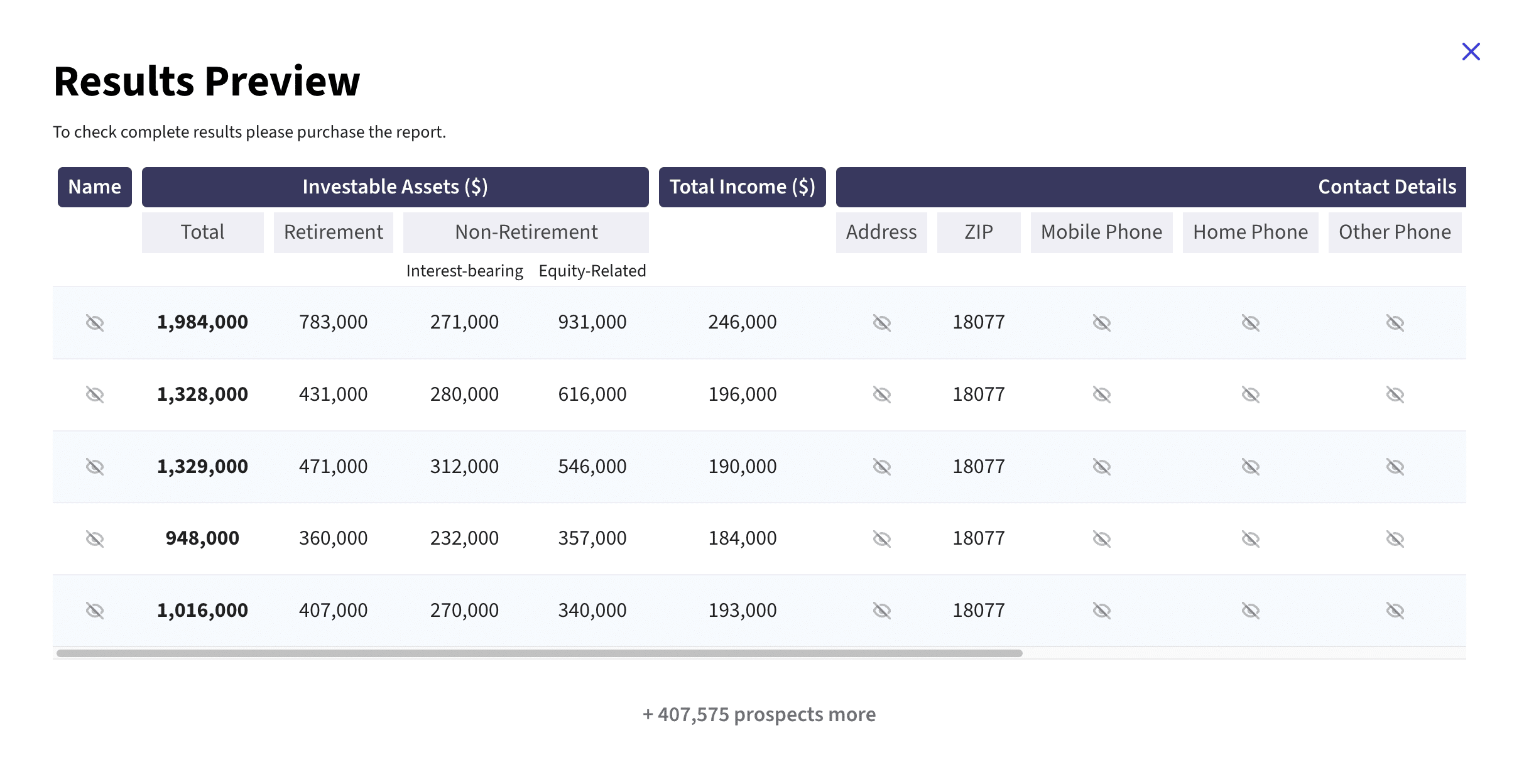 Most prospecting data is incomplete, outdated, or lacks the detail needed to make informed decisions. Our proprietary database, sourced from trusted U.S. government records, provides the most accurate, comprehensive, and frictionless wealth data on the market.